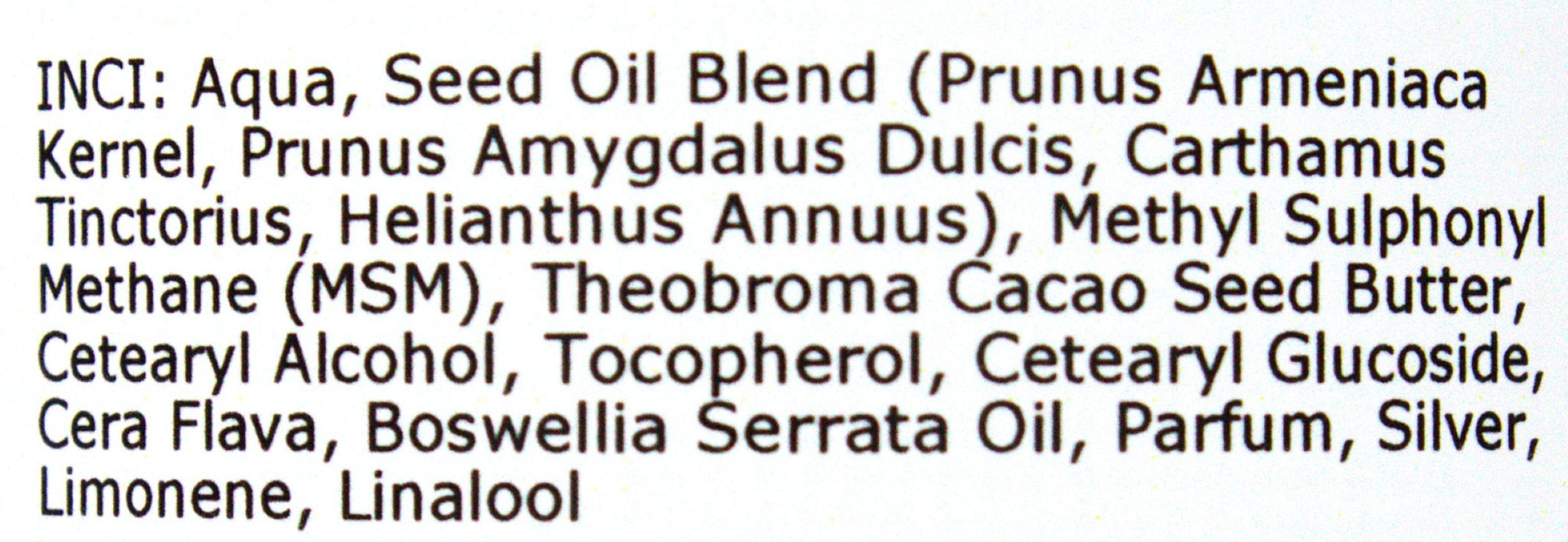 Steam Distilled Water, Seed Oil Blend (Apricot Kernel, Sweet Almond, Thistle, Sunflower), Methyl Sulphonyl Methane (MSM), Cocoa Butter, Vegetal, Vitamin-E, Beeswax, Indian Frankincense Essential Oil, Parfum (Frangipani), MicroSilver