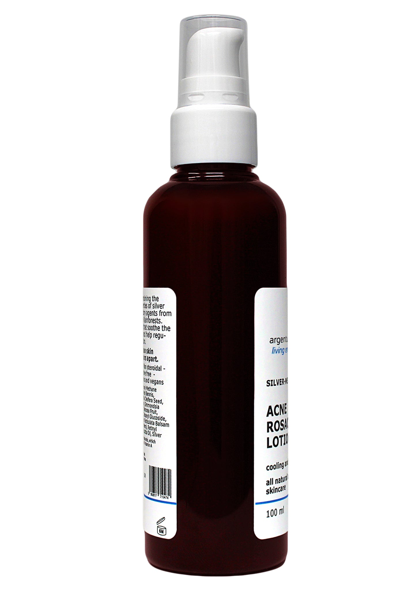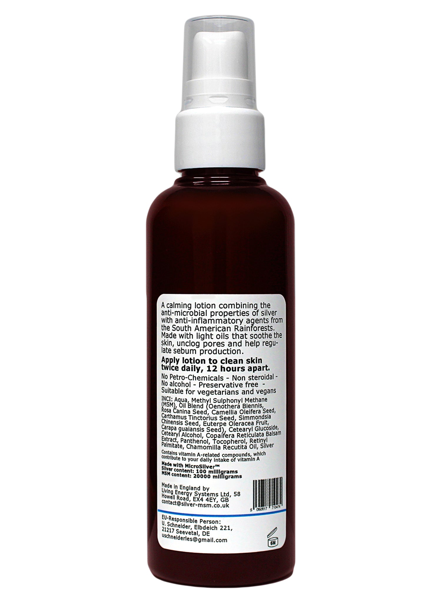 Our Silver-MSM Acne Rosacea Lotion is a soothing, non-steroidal care product for skin prone to acne rosacea and papulopustular rosacea. It combines the anti-inflammatory properties of MicroSilverTM, which helps to combat inflammation and soothe itching, with MSM (organic sulphur), a key nutrient which promotes healthy skin function by improving cell structure and flexibility. Acai oil, andiroba oil, and copaiba balsam – three traditional ingredients from the South American Rainforests – unclog the pores and regulate sebum production. Rosehip seed oil and evening primrose oil are rich in essential fatty acids, and have a non-occlusive moisturizing function. Evening primrose oil also tones the skin and reduces pore size. Added Roman Chamomile essential oil helps to calm redness and itching.