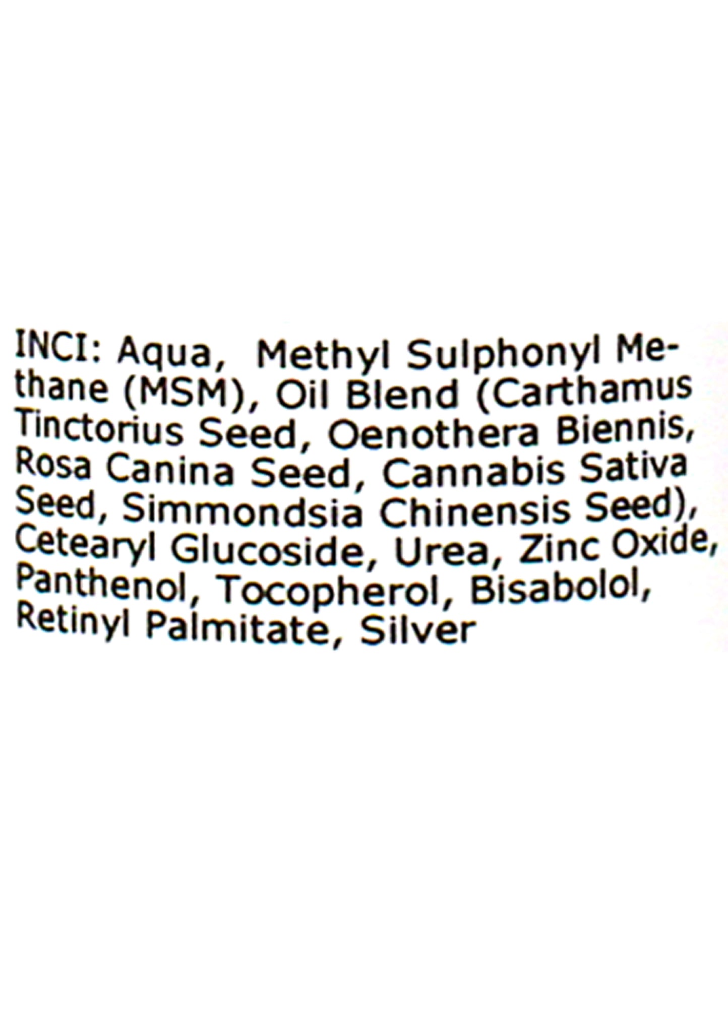 Steam Distilled Water, Methyl Sulphonyl Methane (MSM), Urea, Oil Blend (Hemp Seed, Thistle Seed, Evening Primrose, Rosehip Seed, Jojoba Seed, Sunflower Seed), Vegetal, Zinc Oxide, Panthenol, Vitamin-E (Tocopherol), Vitamin-A (Retinyl Palmitate), Chamomile Extract (Bisabolol), MicroSilver